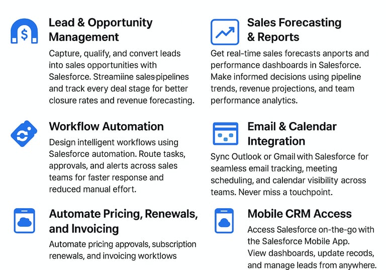 Sales Cloud captures leads from multiple channels, scores them using Einstein AI, and routes them to the right sales reps. This ensures that no opportunity is missed and teams focus on high-value prospects.Pipeline Visibility & Forecasting