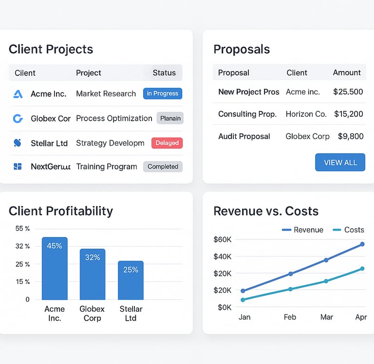 Forecast profitability, utilization rates, and delivery risk across clients and departments.